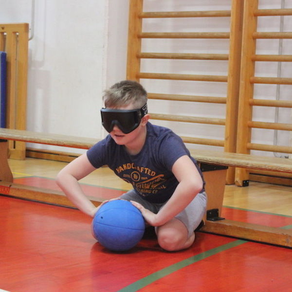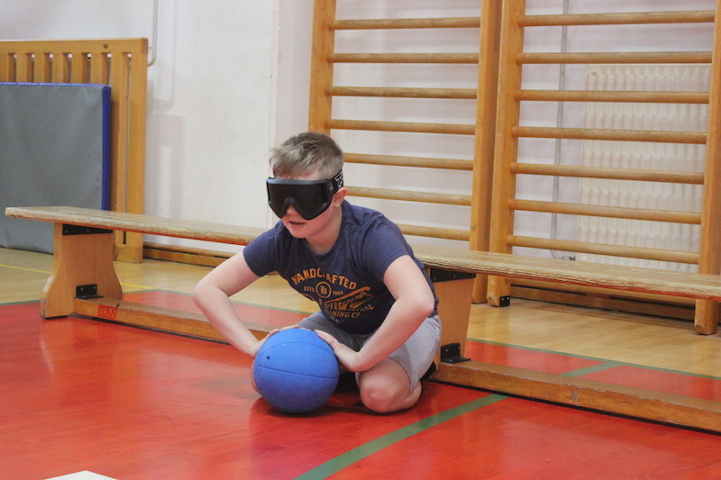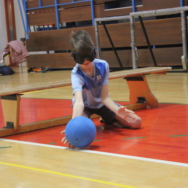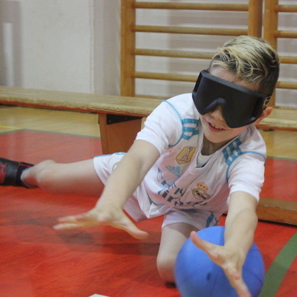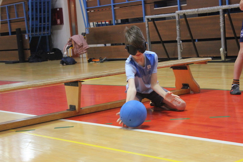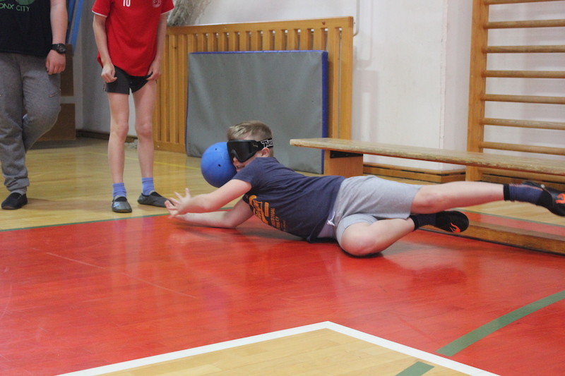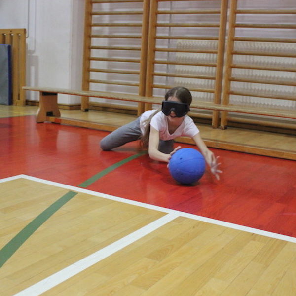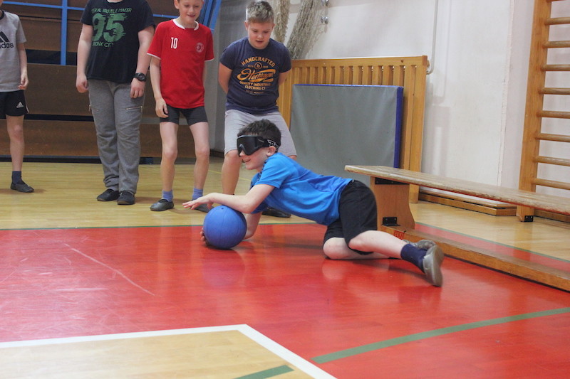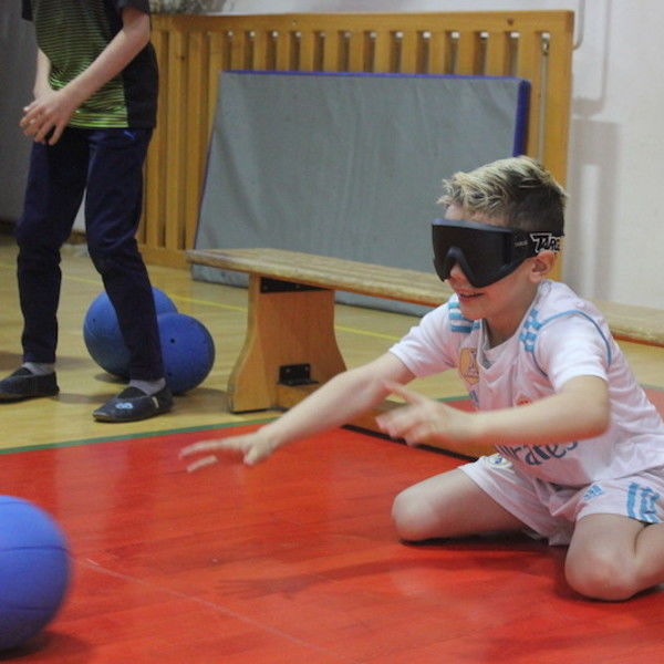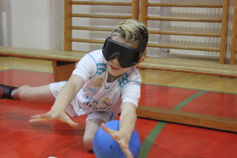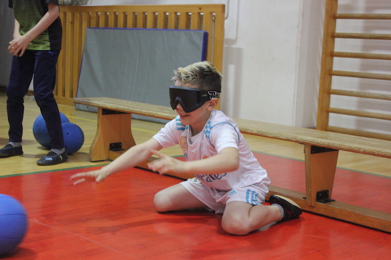 Z zavezanimi očmi poskusijo zadeti oziroma braniti gol.