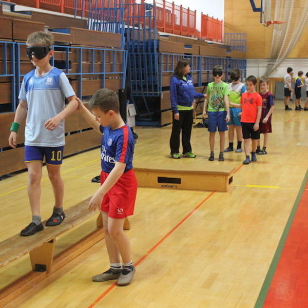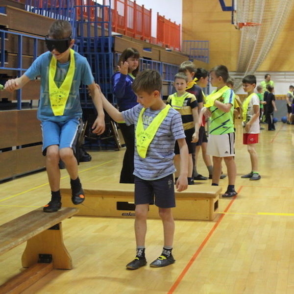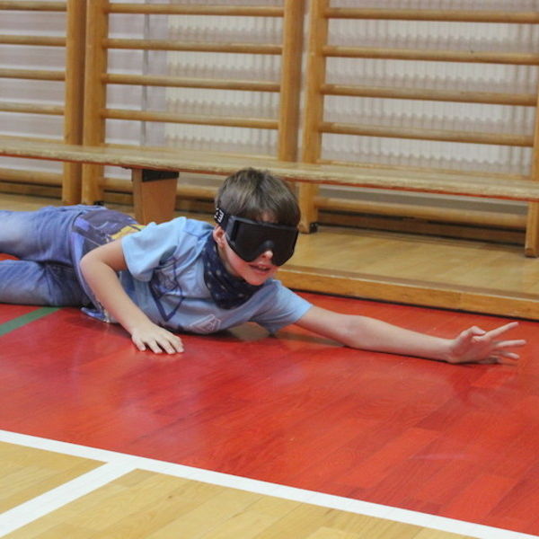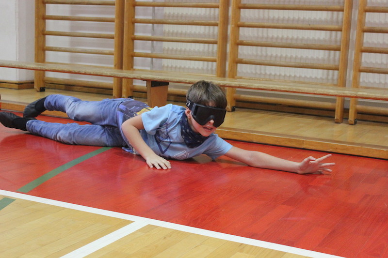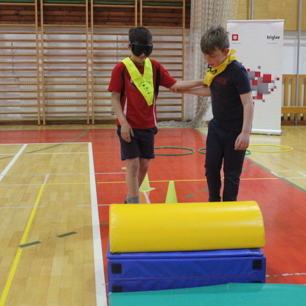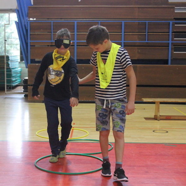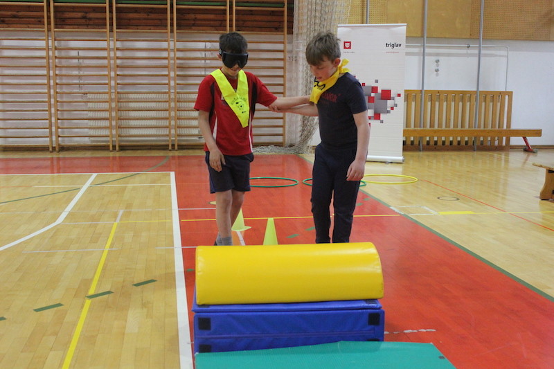 S prevezo za oči je treba premagati poligon. Vsak ”slepec” im ob sebi osebo, ki ga usmerja.