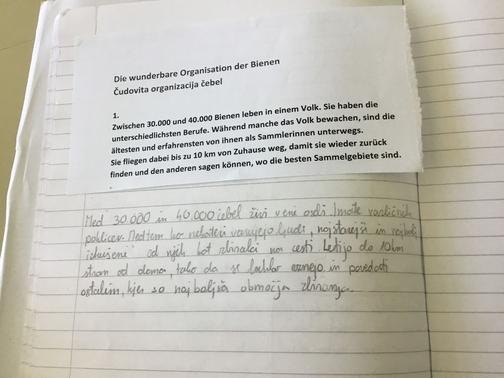3. korak: učenci dobijo besedilo filma (v nekoliko poenostavljeni obliki), razdeljeno na dele. Vsak par dobi en del nemškega besedila. S pomočjo spletnega slovarja in lastnega znanja nemščine ga učenca prevedeta v slovenščino. Priloga 2 (besedilo), priloga 3 (fotografije prevodov besedil).