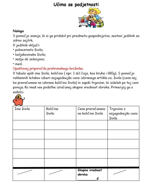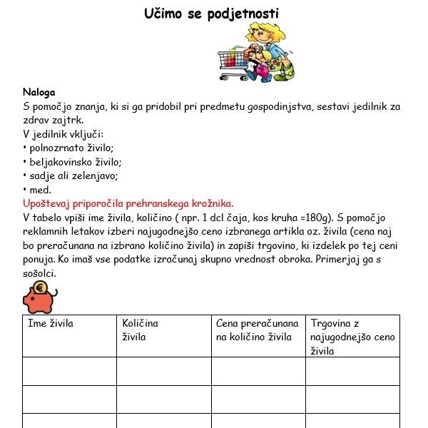 V tabelo delovnega lista vpiše ime živila, količino (npr. 1 dcl čaja, kos kruha =180g). S pomočjo reklamnih letakov izbere in preračuna najugodnejšo ceno izbranega artikla oz. živila in zapiši trgovino, ki izdelek po tej ceni ponuja. Izdelke lahko poišče tudi v spletnih trgovinah.